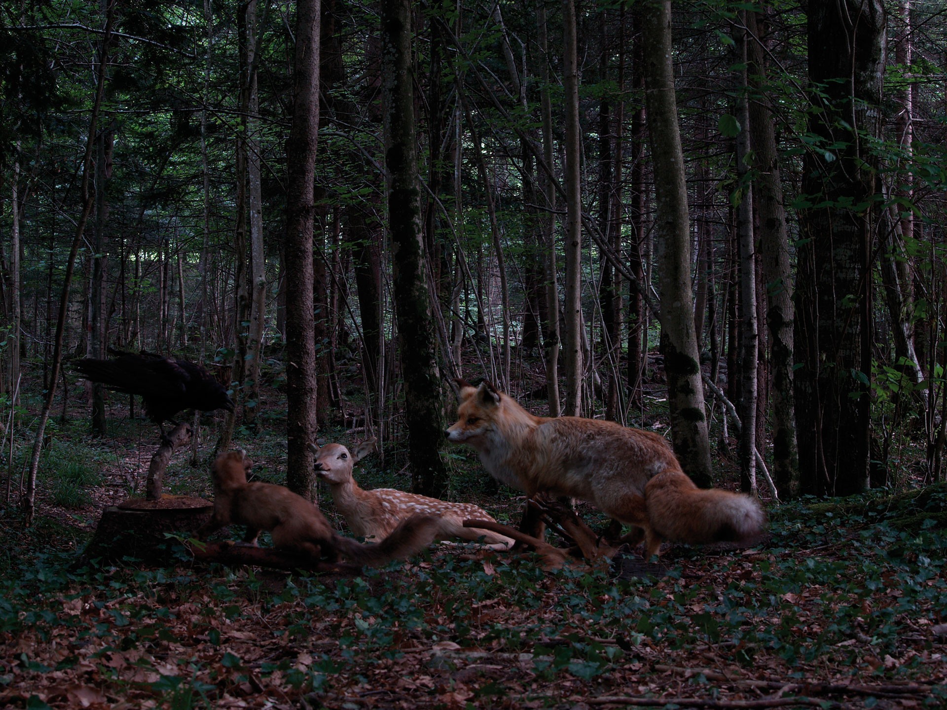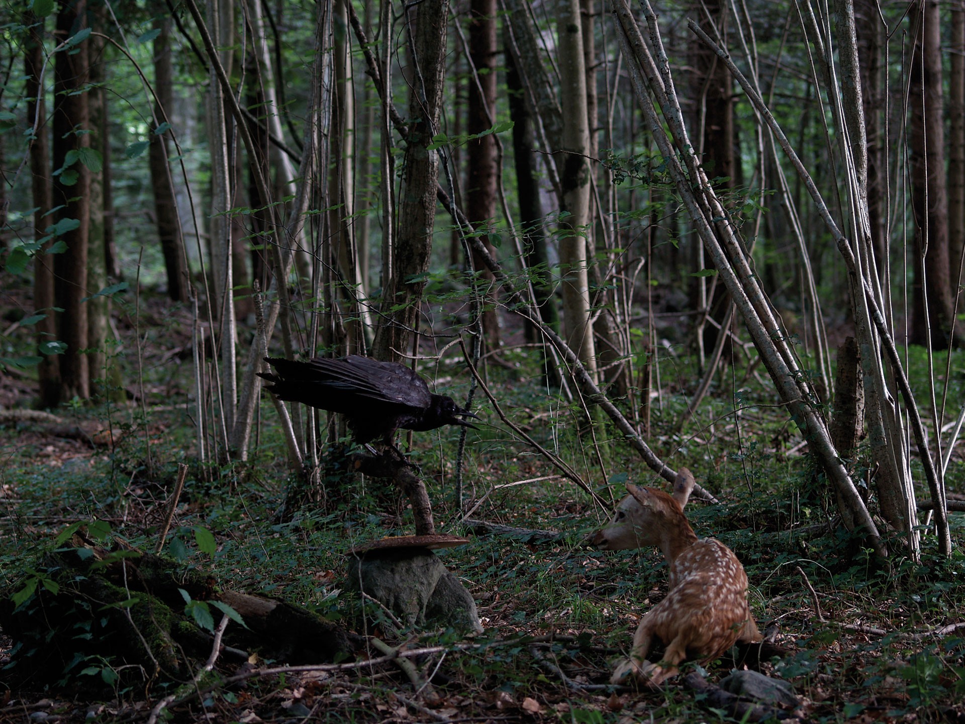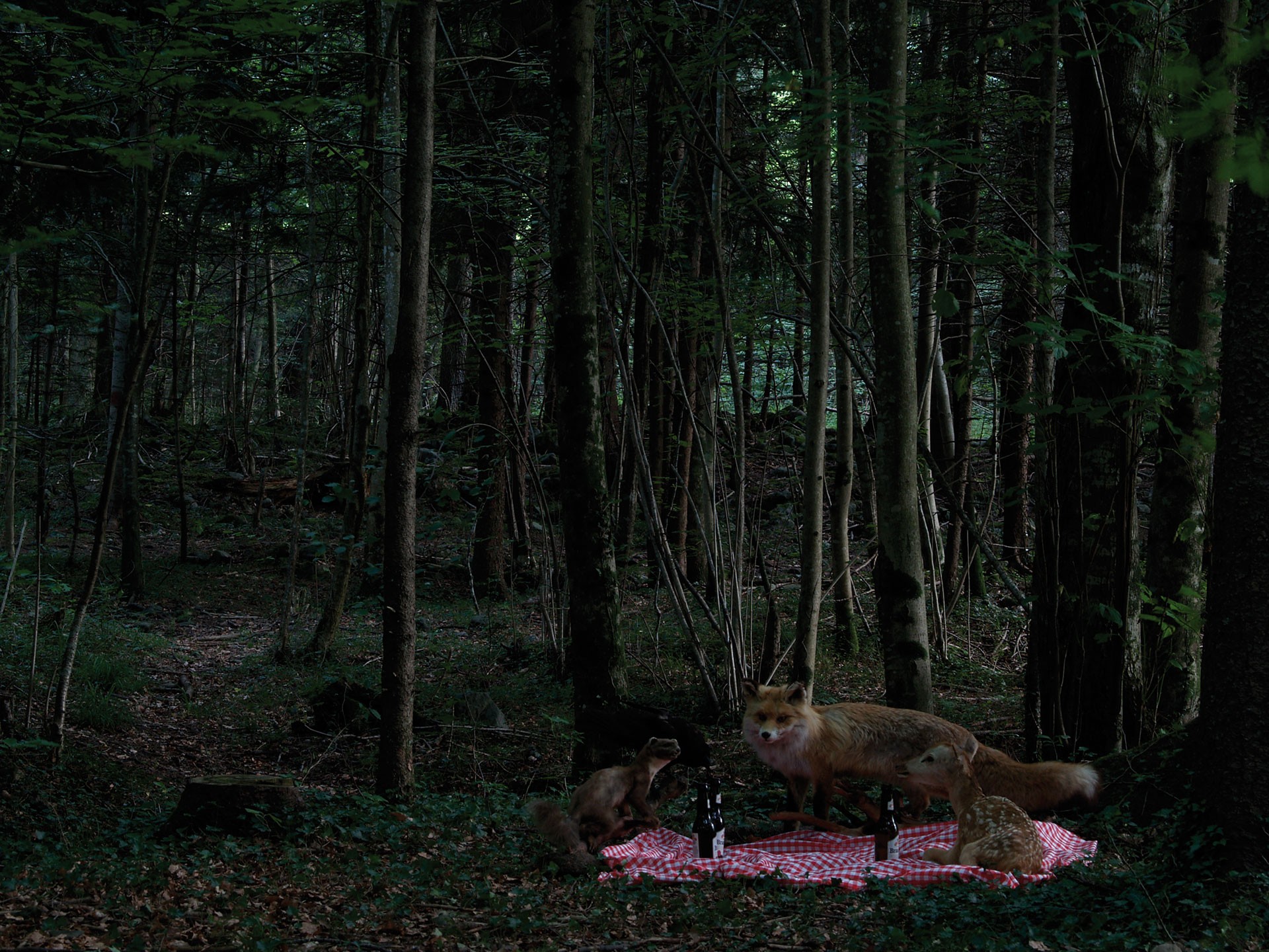 Etwas Märchenhaftes haben diese Waldbilder mit ausgestopften Tieren, wo sich Fuchs und Reh zum trauten Picknick treffen oder der Rabe dem Reh eine Geschichte erzählt. Die ausgestopften Tiere werden damit als Projektionsfläche entlarvt, zugleich verkommt der Wald jedoch zur reinen Kulisse für ein unwirkliches Geschehen. Paradoxerweise wirken die toten Tiere echter als der lebendige Wald.